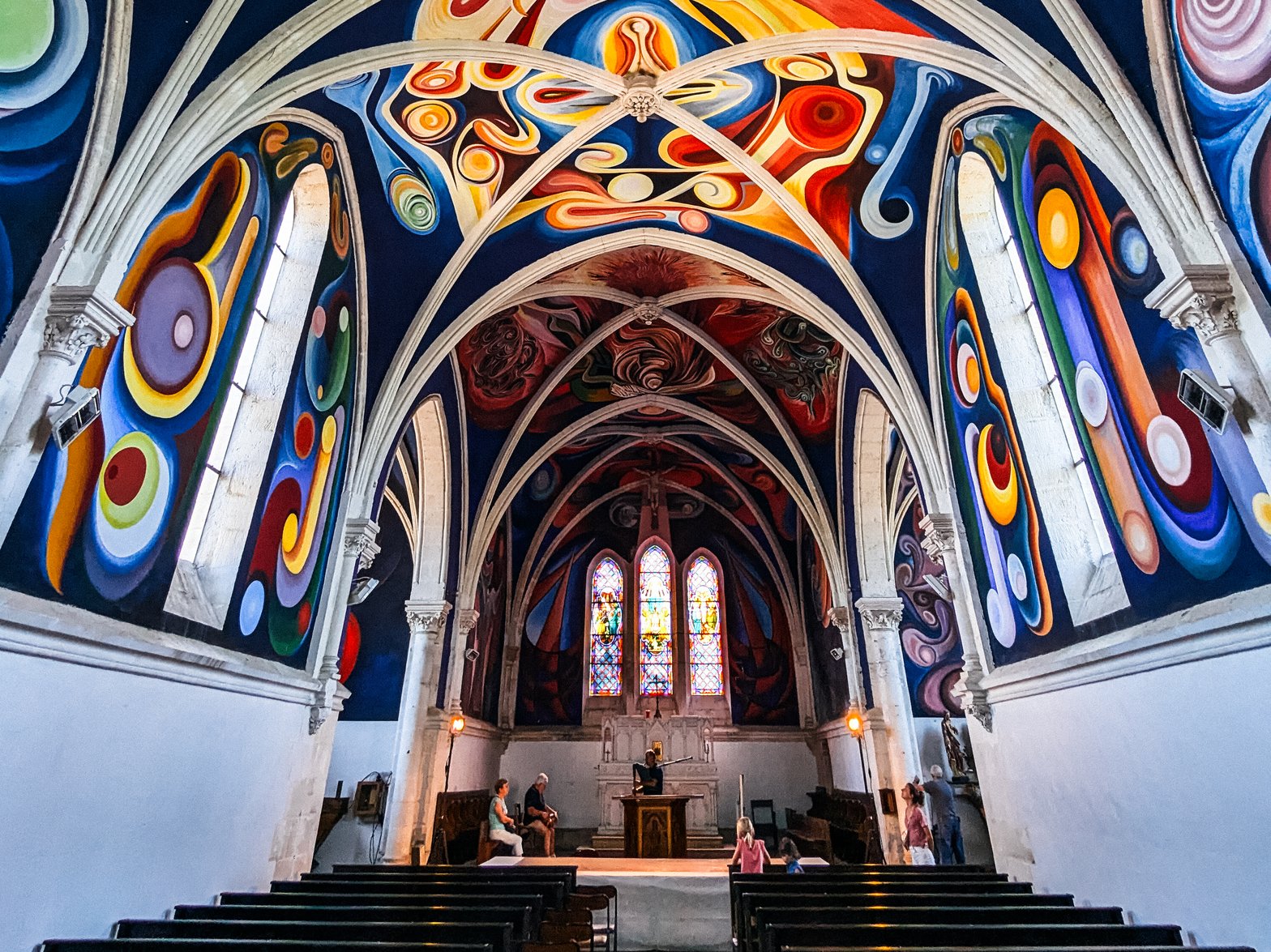 Cette peinture est l’œuvre de l’artiste Carrasco et s’est étalée sur près d’une décennie. Pas très loin de l’église, nous avons été découvrir son atelier, d’autres de ses peintures, sculptures… et échanger quelques mots avec son petit-fils !