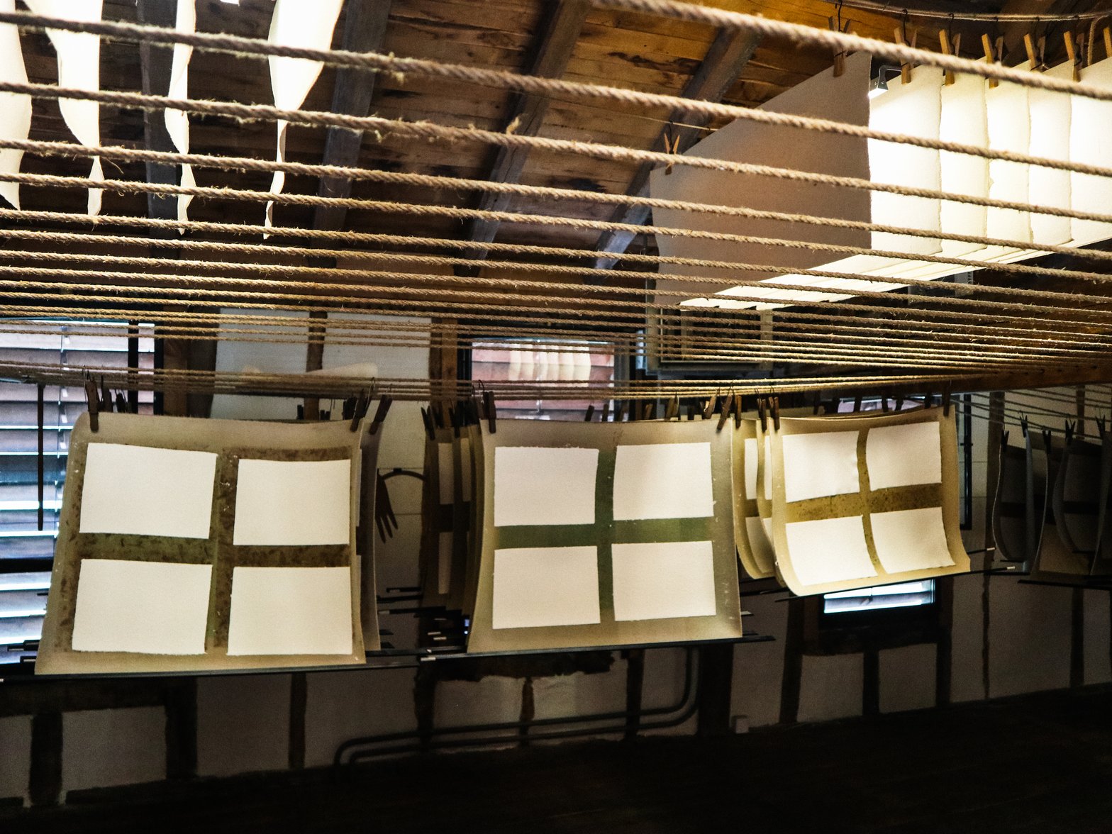 Ici, c’est le séchoir. Il y a du papier fabriqué à partir de plein de choses, dont par exemple de l’artichaut. Le saviez-vous ? Moi, non.