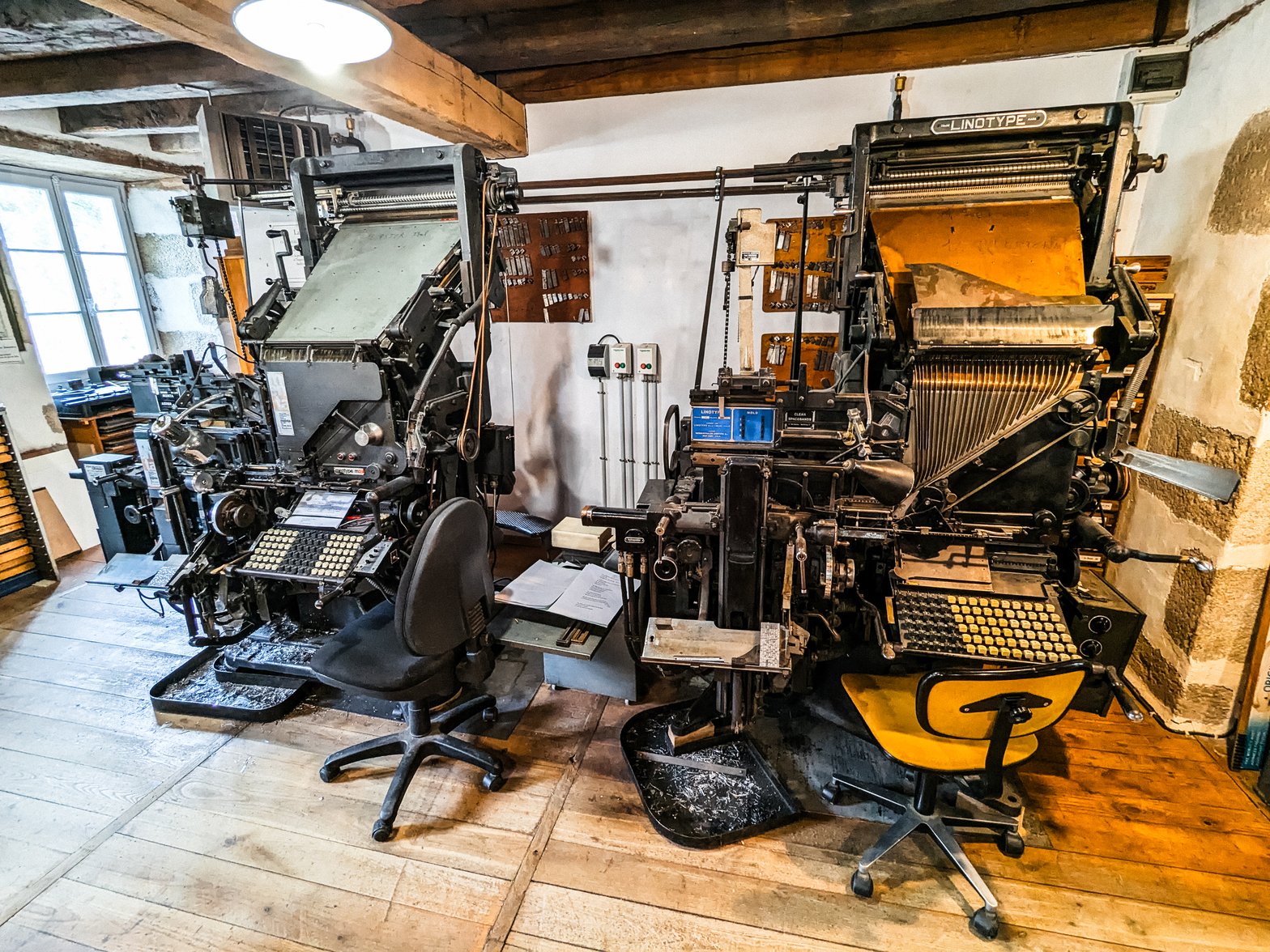 En plus des activités de fabrication de papier, le moulin abrite du matériel d’imprimerie, et pas n’importe lequel. Voici devant vos yeux ébahis, deux linotypes en état de marche. On a même eu le droit à une superbe démo !