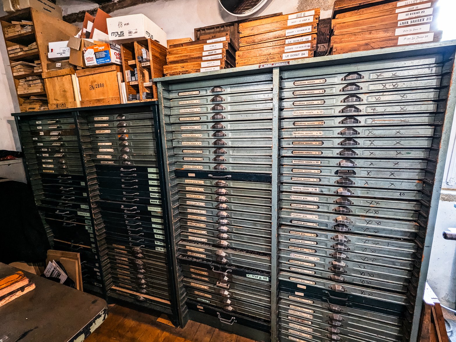 Un échantillon des nombreuses étagères pour stocker et ranger tous les caractères d’imprimerie, du lourd.