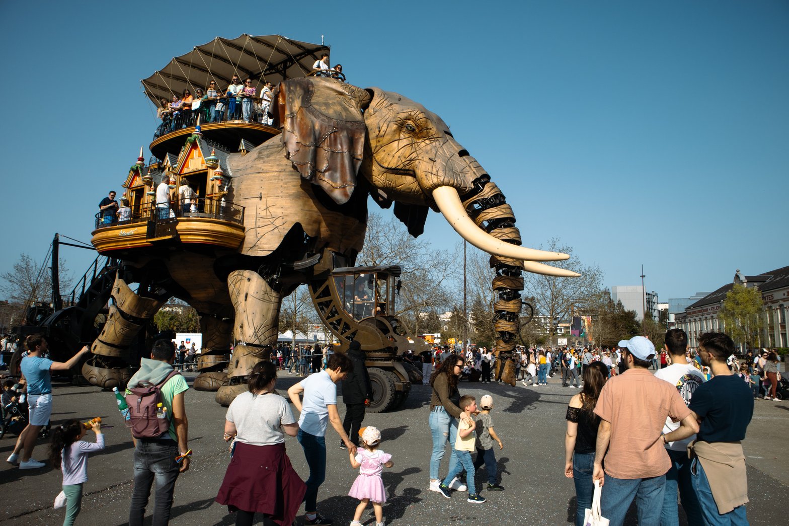 L’éléphant de Nantes, une des célèbres machines de l’île, prêt à asperger la foule d’enfants qui n’attend que ça !