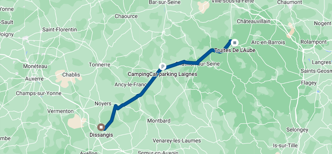 Nous nous arrêtons finalement dans un mignon petit village où un pisciculteur 🐟 (de France Passion, toujours) nous accueille. Nous sommes toujours en Bourgogne. Pourtant je n’ai pas compris qu’il me regarde étrangement lorsque j’ai répondu « de Bourgogne » à sa question « d’où venez-vous ? ». Il a cependant fait preuve de compassion en me demandant de quel département plus exactement. La honte. Pour me rattraper (ou simplement par gourmandise), je lui ai acheté un petit pot de rillettes de truite pour l’apéro. Délicieux.