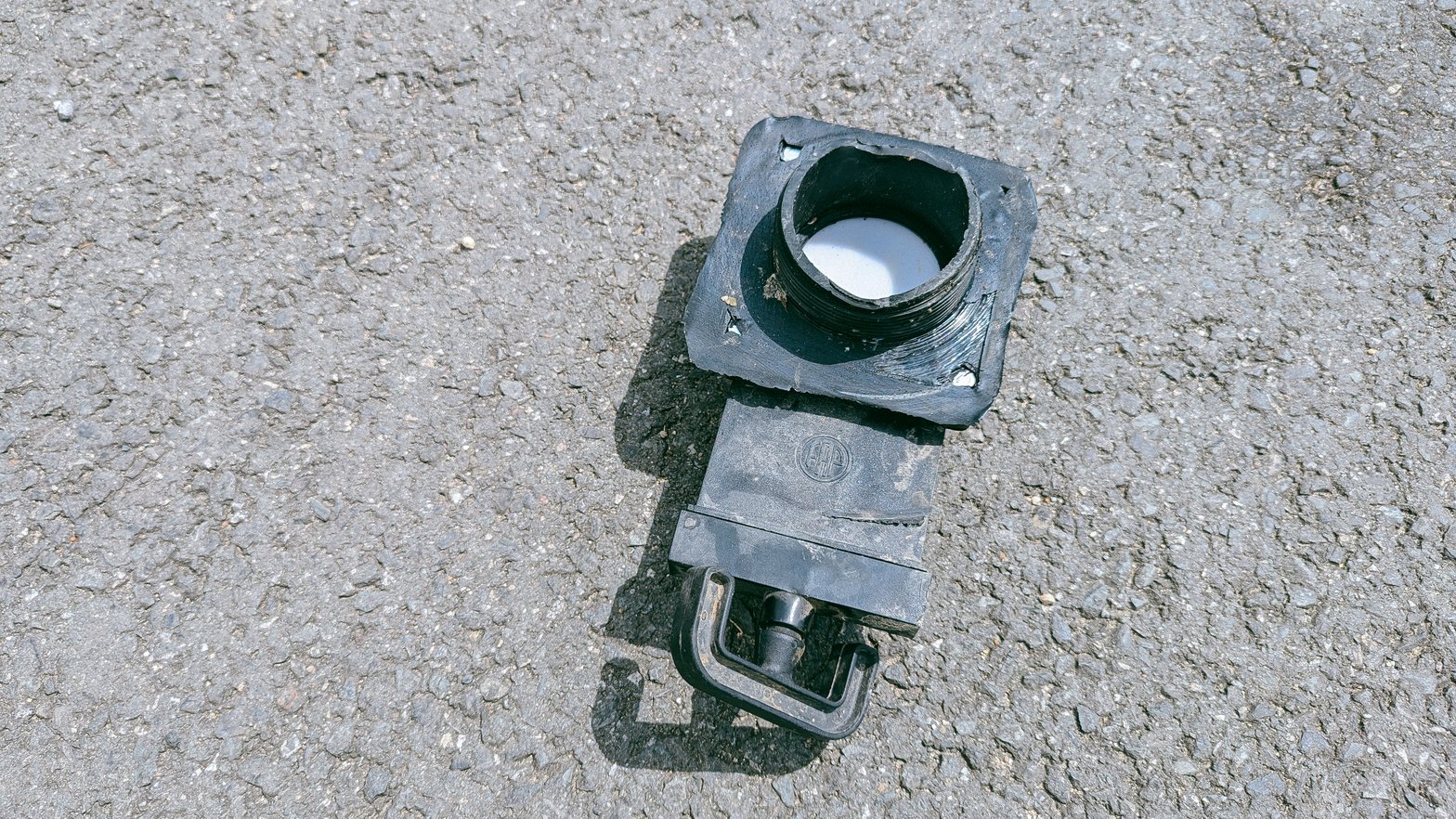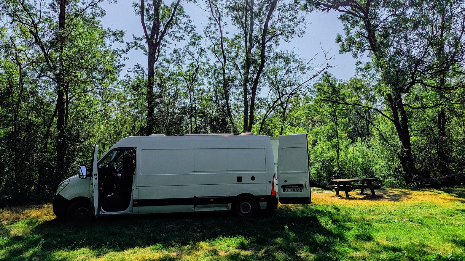 Sur un pont un peu trop pentu, notre cuve d’eaux grises a frotté le sol et cette partie s’est arrachée… Plus de peur que de mal, on a réparé ça quelques semaines plus tard (mais en devant se priver d’eau dans le van, par 40°, sinon c’est pas drôle).