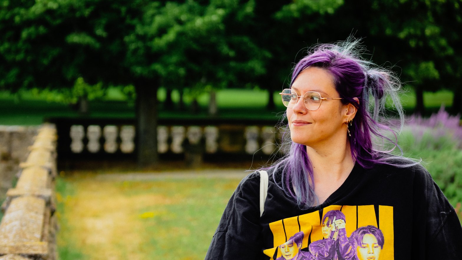Clélia qui se balade dans les jardins du château. Un joli camaïeu lavande.